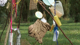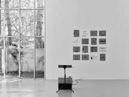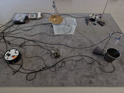 Tambour, platine vinyle de voyage, vinyles, Hexbug Nano, stéthoscope, tables de mixage, seau en métal, écouteurs, bois aimantés, becher, hydrophones, bol en laiton, transducteur, amplificateur, ampoule de brome, cymbale, boîte en plastique, eau, timer, plateau tournant, micro piezo, bambou, câbles, moquette