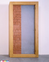 Armoire en bois massif adossée au mur dont la porte s’ouvre sur une surface frontale de terre crue sur 1/3 et de verre dépoli sur 2/3.