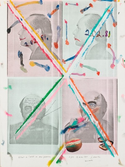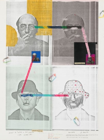 Né d’une commande faite à Philippe Lacoue-Labarthe à l’occasion d’une exposition, l’ensemble de collages regroupé sous le titre Retrait de l’artiste, en deux personnes est une forme de création dialogique menée par l’auteur et le peintre François Martin à partir de clichés d’eux-mêmes pris dans un photomaton. Volontiers qualifiée d’ « essai » par Lacoue-Labarthe, leur œuvre commune aborde le genre de l’autoportrait, tout en proposant une réflexion sur « les questions problématiques du psychologisme, de la ressemblance, de l'identité et du narcissisme1 ». Évoquant le travail de la série dans la peinture de François Martin, l’écrivain n’hésite pas à se référer au champ musical de l’improvisation jazz, en parlant de thème et de « standard », l’analogie étant tout aussi valable pour la présente œuvre. Il note que « c’est dans de telles limites que peut s’éprouver, sur le mode du jeu, une liberté réelle2 ». Retrait de l’artiste, en deux personnes résulte d’un jeu de révélation et de recouvrement des deux figures par la forme, la couleur mais aussi par l’écriture. Remise en question de l’autorité de l’artiste, l’œuvre est définie par Philippe Lacoue-Labarthe comme « une auto-(bio)graphie que sanctionnent deux signatures3 ».