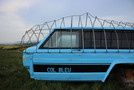 La base de la sculpture est une carrosserie d’un 4×4, du modèle Jeep Cherokee Chief, une voiture américaine qu’il est rare de croiser sur les routes françaises. « C’est avec cette voiture qu’est né le concept de SUV, qui est largement remis en cause aujourd’hui : des voitures très volumineuses qui consomment beaucoup, et polluent en conséquence. Ce qui est étonnant, c’est que la Jeep Cherokee Chief a été pensée pendant la crise pétrolière des années 70. Dans les années 70 se développent l’idée du camping et de l’accès au paysage. Les pubs de l’époque pour ce type de véhicule montrent des pères de famille, ouvrant leurs coffres une hache à la main, garés près de sommets, au milieu de forêts... Les voitures Jeep sont des véhicules pensés pour être très utilitaires : permettant aussi bien de travailler à la ferme avec sa bagnole aux 4 roues motrices, que de partir en week-end à l’aventure. » explique Maxime Lamarche. Il complète : « Ça m’intéressait de retrouver cette carrosserie, car aujourd’hui, cette bagnole est une carcasse, un déchet. Je le récupère, le re-fonctionnalise, pour en faire autre chose en n’en conservant que le design archétypal de cette période, l’habitacle. Si on a plus le pétrole qui permettait de faire fonctionner ses engins, ils tombent en désuétude, on est à pied, et il va falloir qu’on s’abrite. Mon idée est qu’on s’abritera dans des rebuts de la société précédente, comme celui-ci. C’est quelque chose qui revient dans mon travail de sculpteur, cette idée de sculpture fonctionnelle, basée sur la récupération d’un objet symbolique déchu du siècle dernier. Le projet est également porté par son nom : Refuge du col bleu, qui est formé comme les noms classiques de refuges, qui sont généralement baptisés d’après les noms des cols ou sentiers alentour » explique Maxime Lamarche qui poursuit : « "Col bleu" parce qu’il est installé sur un col, et pour le jeu de mots avec le "ciel bleu" qui me plaisait comme on est dans le paysage, et avec le "col bleu" des ouvriers. Évidemment, cette référence m’intéressait dans son rapport à la voiture. Dans différentes discussions au cours de ma résidence, beaucoup d’anciens ardéchois m’ont parlé de ces gens qui, au siècle dernier, sont tous partis à pied pour aller travailler dans les usines. Le territoire est très dur, c’est difficile d’y vivre, les gens descendaient dans les usines pendant l’âge d’or de l’industrie. Symboliquement, ces populations complètes descendues dans les usines pourraient remonter se réfugier sur leurs terres, comme un juste retour aux sources. Le Refuge du col bleu est un hommage à cette histoire ouvrière locale, mais aussi mondiale, car pour créer ces voitures il fallait des grosses productions, des chaînes de montage qui sont liées à l’histoire américaine. » Maxime Lamarche, Refuge du col bleu, 2020-2021 - Caisse de Jeep Cherokee Chief, peinture, bois de sapin - 4 x 1,90 x 1,80 m.