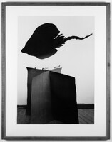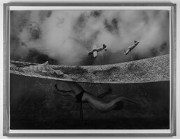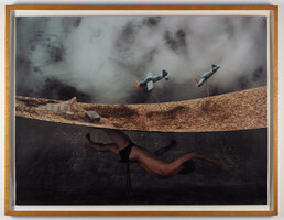 Teintées d'humour et de surréalisme, les œuvres des années 1980 mettent en scène des personnages désorientés ou naufragés, qui semblent lutter contre les éléments au sein d'un « univers en moquette, […] d'un champ pneumatique et cosmique indéfini »(1) où tout est sens dessus dessous. Peu à peu, la figure humaine s'efface et l'espace devient davantage abstrait : au tournant des années 90, Boyd Webb réalise d'étranges compositions kaléidoscopiques où la forme animale est réduite à une présence indicielle (Croup en 1988, ou Cortex en 1990). Une tendance à l'abstraction qui se déploie dans ses dernières œuvres, des tableaux photographiques synthétisant phénomènes atmosphériques et biologie cellulaire, mais toujours fabriqués de toutes pièces.